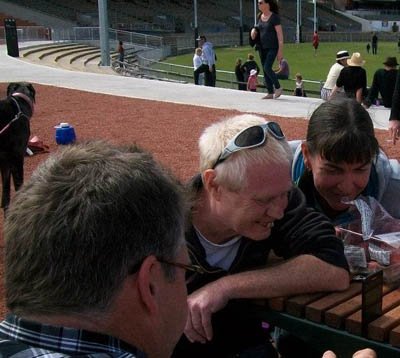Clive ‘Dundee’ Cooke & friend, Collingwood football ground, Sat 11 Feb 2012.